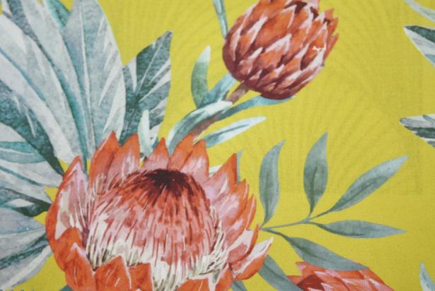 “King Protea” – Flowers arranged on yellow background; Teal-Salmon combination/ Cotton